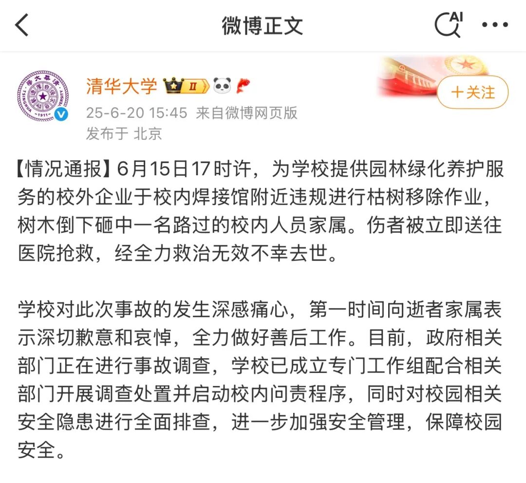 据清华大学微博通报,6月15日17时许,为学校提供园林绿化养护服务的校外企业于校内焊接馆附近违规进行枯树移除作业,树木倒下砸中一名路过的校内人员家属。伤者被立即送往医院抢救,经全力救治无效不幸去世。